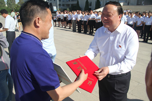 在當(dāng)日同時(shí)舉行的“銀川市黨內(nèi)關(guān)愛資金”捐款儀式上,集團(tuán)黨委捐款貳拾萬元。市委徐廣國書記給集團(tuán)公司雷光新董事長頒獎(jiǎng)。